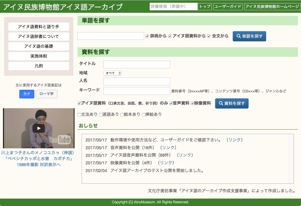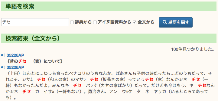 ・アイヌ語はカナ表記、ローマ字表記とも可能ですが、検索結果はトップページで選んだ表記法で表示されます。
