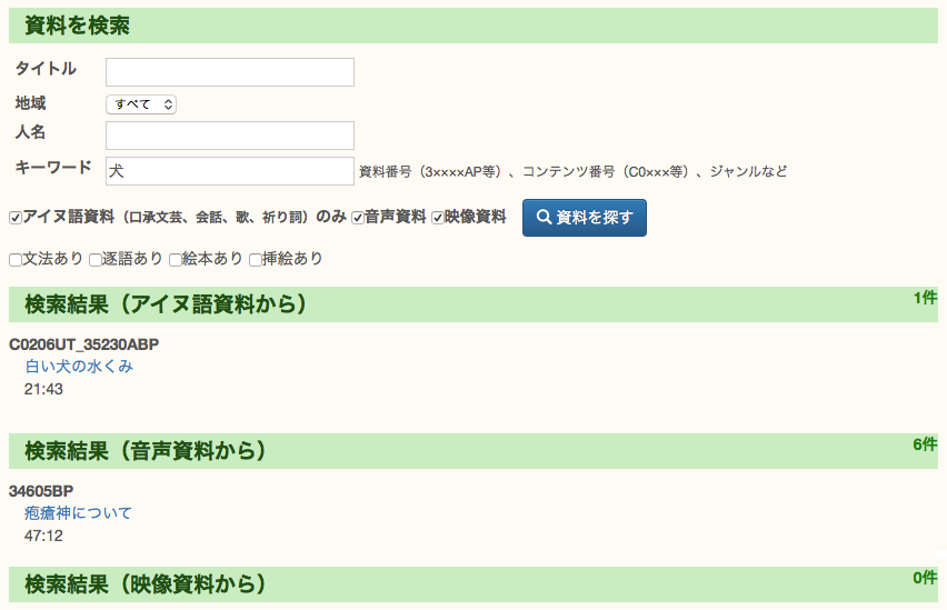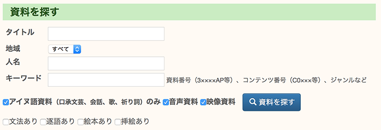 ・全文から:音声資料、映像資料の本文を検索します。前項のアイヌ語資料も含みます。