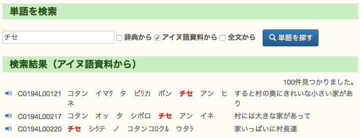 ・アイヌ語資料から:アイヌ語コンテンツ(口承文芸、会話、歌、祈り詞など)の本文を検索します。