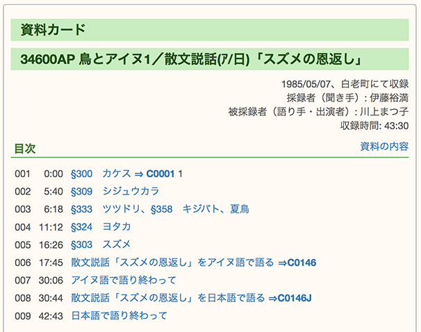 3-⑵単語検索または4−⑵資料検索で、アイヌ語資料の検索結果をクリックすると、右側に以下の画面が表示されます。