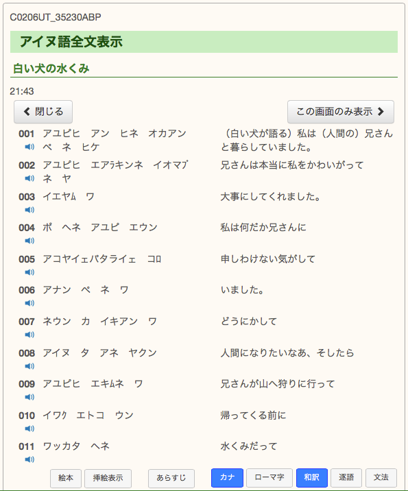 - アイヌ語全文表示の画面下には、以下のようなボタン類が並んでいます。