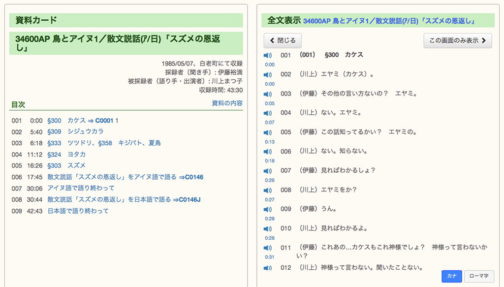 (トップページで選択した表記法と異なる表記で検索した場合は、赤字では表示されません。) - 資料番号(音声資料3××××P〜、映像資料2××××P〜)をクリックすると、右側に全文表示画面(⇒5−⑵右)が表示されます。