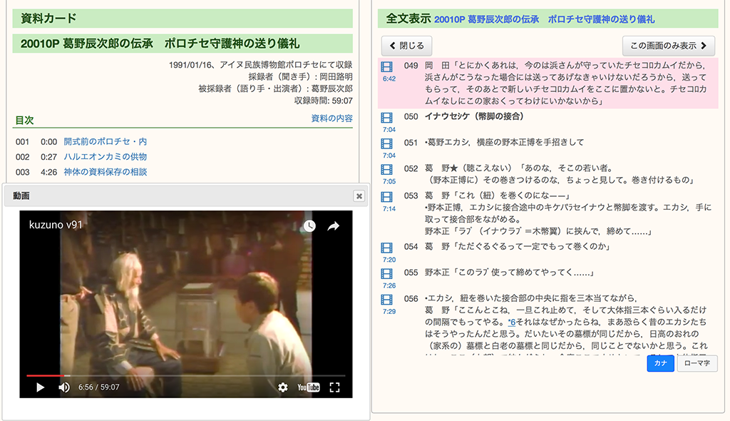 映像資料のタイトルをクリックすると、資料カード(目次)が表示され、さらに目次の行をクリックすると、右側に全文が表示されます。