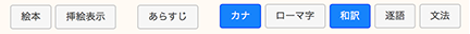 - カナ、ローマ字、和訳、逐語、文法は、ボタンをクリックして表示/非表示を選択できます。データがない場合には表示されません。